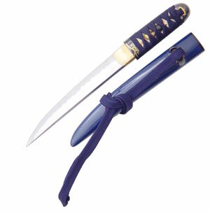 Each piece in the Orchid Series (SH1207, SH1208, & SH1209) has a hand-forged & folded K120C powder steel blade, differentially tempered using a traditional claying method to produce an HRC60 edge, HRC40 back. The temper line (hamon) is evident and prominent and the grain pattern (hada) shows distinct layers. The saya are deeply lacquered in blue. High quality ray skin (same) is used on the tsuka, and the tsuka-ito and sageo on all three pieces are woven from premium Japanese cotton. The tsuba of the katana and wakizashi is of blackened iron, with an Orchid and Butterfly decoration inlaid in silver, brass and copper. The scabbard mouth (koiguchi) and cord knob (kurikata) are of buffalo horn, and the fuchi, kashira and kojiri are of bronzed iron with silver and gold detailing. The blade collar (habaki) is a one-piece brass construction. The katana and wakizashi feature a medium-length (chu) kissaki. See Models SH1208 and SH1207 for the Wakizashi and Katana details.