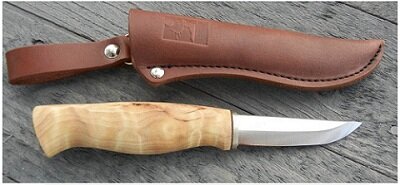 The Falcon™ features a beautiful curly birch handle with a 3" razor-sharp stainless steel blade. This knife has a full-tang construction with a nickel silver bolster. These knives are hand made in Finland. The knife comes with a swinger style dark brown leather sheath.