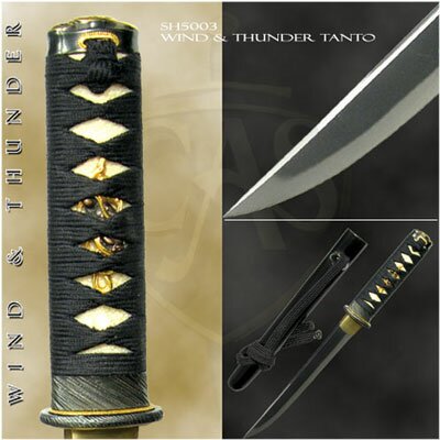 Each piece in the Wind & Thunder Set (SH5001 & SH5003) has a hand-forged 1065 high-carbon steel blade (nagasa) and is differentially tempered using a traditional claying method. The blades in the set feature a large o-kissaki. The Wind & Thunder Set is fitted with the black iron Raiden tsuba and Tomoe mon motif fuchi and kashira. The handle is wrapped in genuine ray skin (same) and the tsuka-ito and sageo are premium Japanese black cotton. The saya is done in a deep black lacquer and the sageo is black Japanese cotton. CAS/Hanwei have designed a cutting katana with thicker and heavier blades specifically for the martial artist that needs a sword for the demands of cutting the larger goza (tameshigiri). This set is ideal for those looking for a katana for the rigors of Battojutsu.